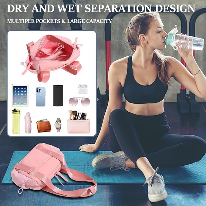 - Dry & Wet Separation Compartment: This cute gym bag for women features a dedicated wet compartment to store damp clothes or toiletries separately, keeping other items clean and organized. Perfect for workouts, travel, and fitness routines