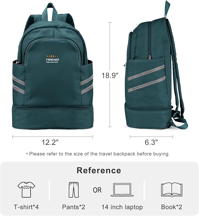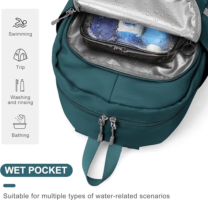 - WET POCKET: The wet pocket can hold wet items, such as toiletries, towels, swimming suits, etc., which is convenient for you to use when you are on a business trip or shower after exercise, and avoids getting wet in other parts of the backpack