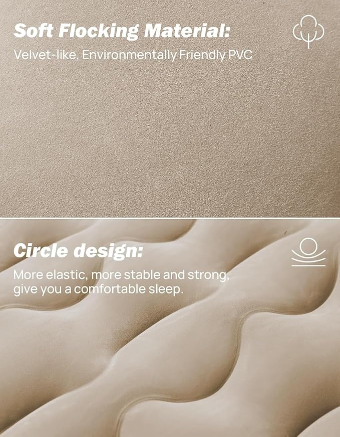 - 【Thickened Fabric Surface】: Thickened air cushion increases stability and comfort. Thickened PVC material can easily bear the weight of two adults. The surface and pillows is made of soft velvet-like flocking fabric. Making it also feel very cushiony