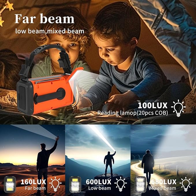 - LED Flashlight & Reading Lamp& Headphone Jack:This Solar crank radio includes an emergency flashlight and a SOS alarm, along with a versatile 4-mode LED flashlight that offers high beam, low beam, combined beam, and SOS flashing functions. Additionally, it is equipped with an SOS siren for emergency. This hand crank radio with its flashlight and reading lamp is a must-have for all you outdoor junkies. Besides, it includes a 3.5 mm headphone jack, allowing you to listen to the weather broadcast at night without disturbing others.