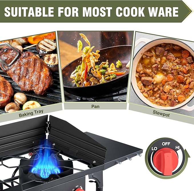 - 🌸【High Power Output】The 150000 BTU stove has a strong flame and is equipped with multiple independent burners, each of which outputs up to 75,000 BTU, suitable for quickly cooking large quantities of food, such as frying fish, steaming crabs, or wok cooking