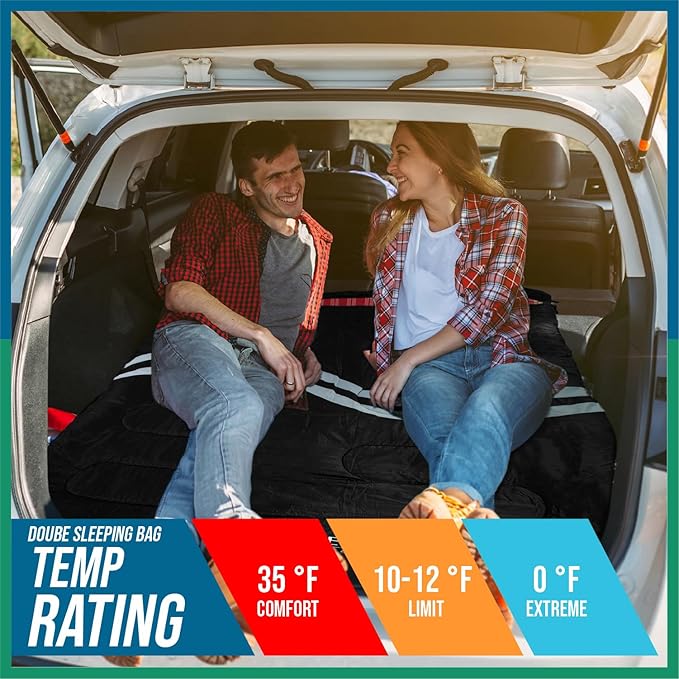 - SKIN-FRIENDLY & DURABLE: This Queen-size double sleeping bag features a soft, gentle liner and a waterproof, durable 80D polyester exterior for long-lasting use