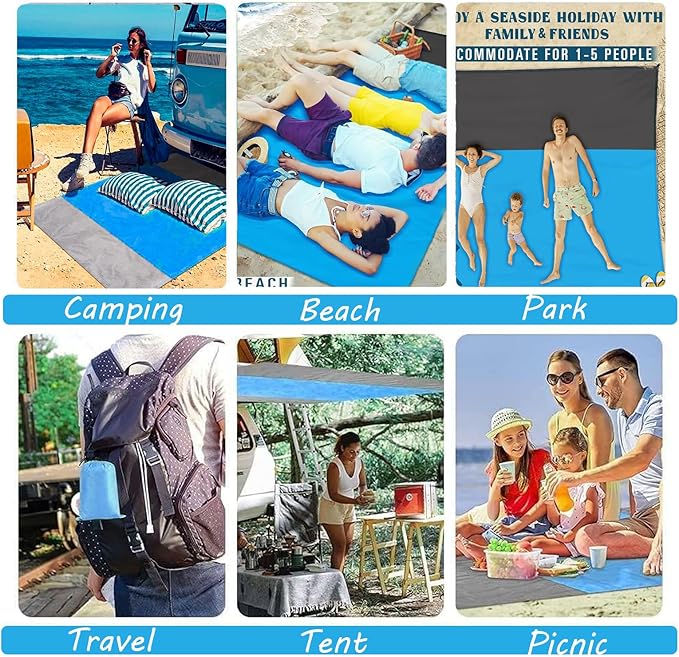 • ✔OUTSIDE BEACH BLANKET - The extra-large beach blanket provides ample space for lounging, picnics, or family gatherings. Including 1 * Sand Proof Beach Mat;4 * Durable ABS Anchors Stakes; 1* Carabiner; 1 * CARRY BAG.Whether you're at the beach, park, or camping, this oversized picnic blanket ensures comfort and convenience. Keeps all your beach stuff & beach supplies sand-free