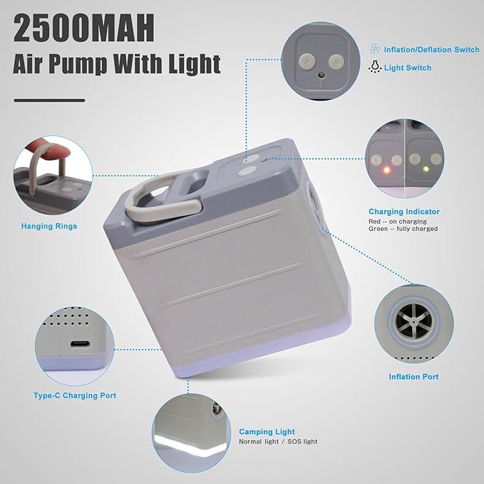 - 【𝐌𝐮𝐥𝐭𝐢-𝐟𝐮𝐧𝐜𝐭𝐢𝐨𝐧𝐚𝐥 𝐈𝐧𝐭𝐞𝐥𝐥𝐢𝐠𝐞𝐧𝐭 𝐀𝐢𝐫 𝐏𝐮𝐦𝐩】-The built-in air pump contains 2*2500mAh high capacity battery, can fill the camping pad in 45S. Pump is rechargeable and detachable. A full charge 3.5 hours can inflate the pad about 7 cycles. The normal light of pump for campsite illumination and the SOS light feature for emergencies. it also has a hook to be attached to the tent. Pls don't run the pump continuously for over 5 mins. Let it cool down before the next use.