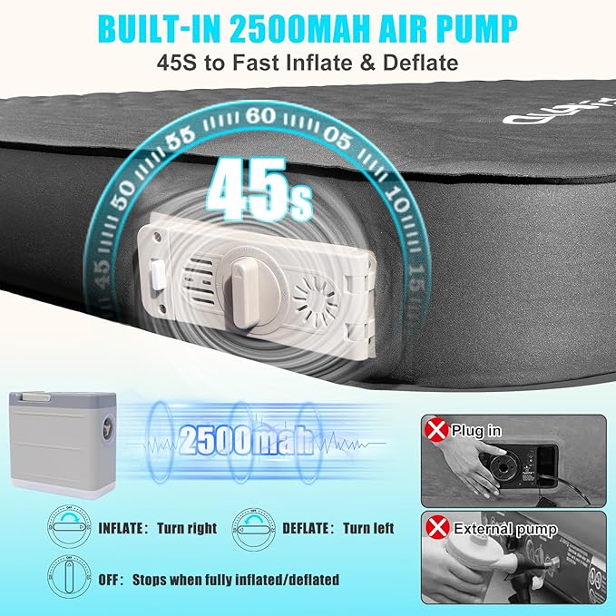 - 【𝐄𝐟𝐟𝐨𝐫𝐭𝐥𝐞𝐬𝐬 𝐈𝐧𝐟𝐥𝐚𝐭𝐢𝐨𝐧 & 𝐂𝐨𝐦𝐩𝐚𝐜𝐭 𝐒𝐭𝐨𝐫𝐚𝐠𝐞】-Say goodbye to manual pumping! Our sleeping pad for camping features a built-in intelligent air pump can fully inflates the mattress in under 45 seconds. When adventures end, just rotary pump switch—the pad can compresses itself into a compact bundle, fitting effortlessly into its carry pouch. Camp setup just became vacation-easy!