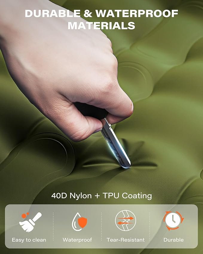 - 【Outdoor Grade Material】:Made of 40D nylon with TPU coating, this camping mattress pad is wear-resistant, tear-resistant, and easy to clean. Even in the rain, a quick wipe keeps it dry. Perfect as hiking gear, a travel bed, or for car camping—built to last and perform. Rigorously tested for durability, so you can rest easy wherever your adventure takes you.
