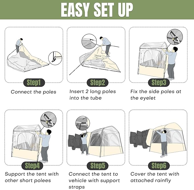 - 【Complete Package for Easy Setup】This set includes 1 SUV tent, 1 carry bag, 7 FRP poles, 8 ground nails, 4 windproof ropes, and 1 user guide. For quick and hassle-free installation, it is recommended to set up with two people for a smoother experience.