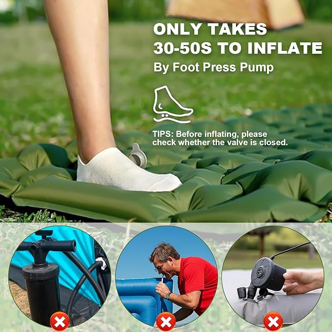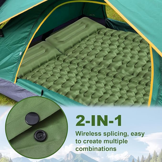 - 【Quick Inflation & One-Second Deflation】Built-in foot pump inflates the sleeping pad in just 40 seconds — no extra tools needed. When it’s time to pack up, deflate in one second with the quick-release valve. Side snap buttons let you connect two pads to create a double bed, perfect for couples or families.