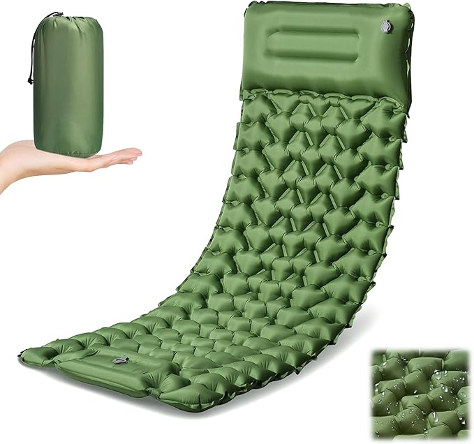 - 【 Enhanced Comfort with Built-in Pillow & 4" Thickness】Enjoy restful sleep anywhere with our 75" x 27" inflatable sleeping pad, designed with 4 inches of cushioning support to relieve back pressure. The built-in ergonomic pillow adds head and neck comfort, making it perfect for camping, backpacking, hiking, or travel. No more tossing and turning in the wild — sleep like you're home.