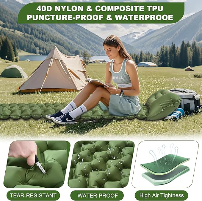 - 【Durable, Waterproof & Made for the Outdoors】Constructed from rugged 40D nylon and multi-layer TPU, this camping mat resists tears, punctures, and moisture — ideal for rocky ground and wet conditions. Easy to clean with just a quick wipe. Comes with 3 repair patches so you're always ready for the unexpected.
