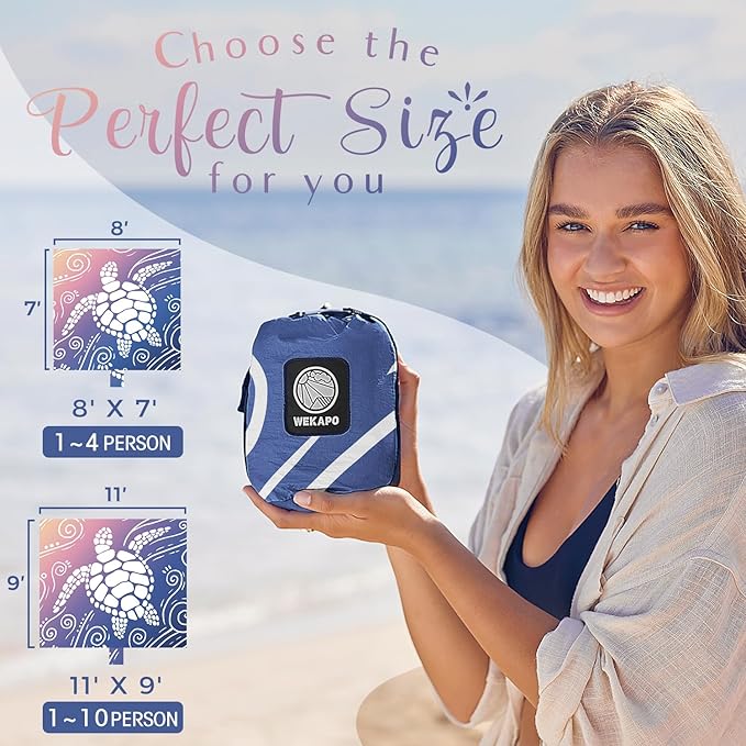 WEKAPO Beach Blanket Waterproof Sandproof Oversized Extra Large Sand Free Beach Mat with Stakes, Storage Bag - Essentials for Outdoor Beach, Picnic (Deep Blue Sea Turtle, 11 X 9 FT (1~10 Person))