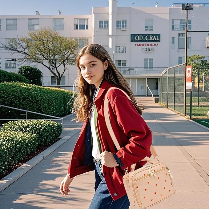 - It's super adorable and very classy with cute strawberry pattern,The bag is leak-proof and friendly to carry on.Your kids will love to bring his/her lunch box to school everyday!