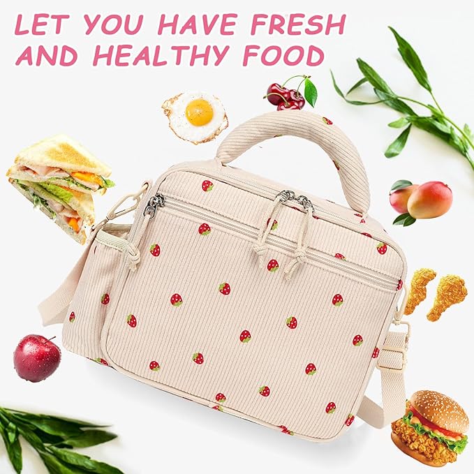 - The Reusable Lunch Box is made of the durable strawberry corduroy material,food safe insulated lining and sturdy double SBS zippers.The padding, stitching, fabric, liner, and overall construction is quality.Lunch bag with adjustable shoulder strap, which provides three carrying ways: shoulder bag, cross-body bag or chic handbag.