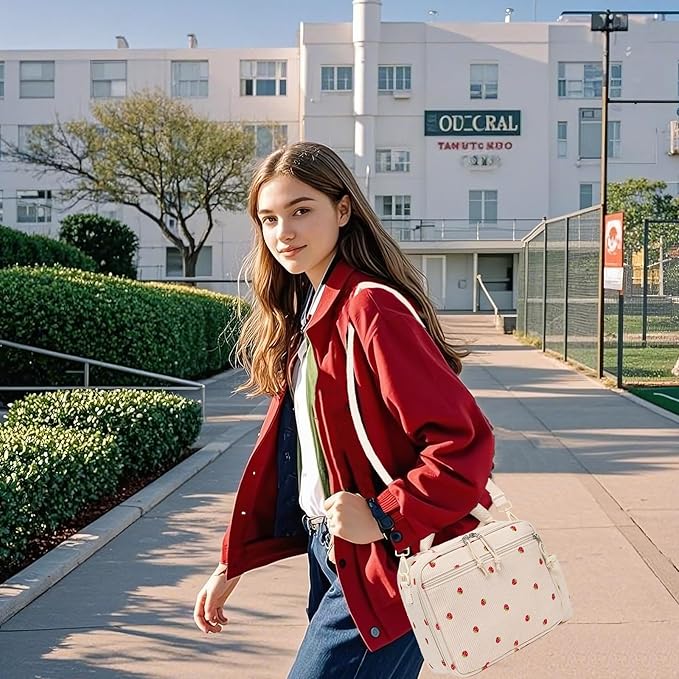 - It's super adorable and very classy with cute strawberry pattern,The bag is leak-proof and friendly to carry on.Your kids will love to bring his/her lunch box to school everyday!