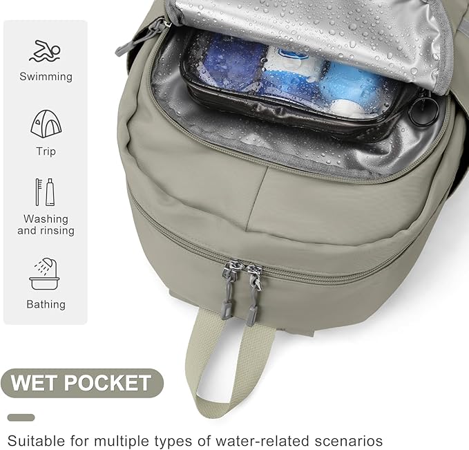 - WET POCKET: The wet pocket can hold wet items, such as toiletries, towels, swimming suits, etc., which is convenient for you to use when you are on a business trip or shower after exercise, and avoids getting wet in other parts of the backpack