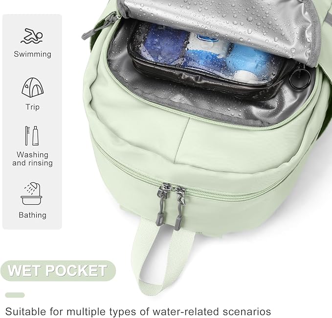 - WET POCKET: The wet pocket can hold wet items, such as toiletries, towels, swimming suits, etc., which is convenient for you to use when you are on a business trip or shower after exercise, and avoids getting wet in other parts of the backpack