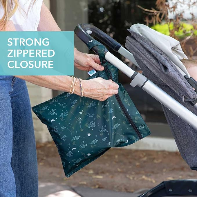 Bumkins Waterproof Wet Bag for Baby, Travel, Swim Suit, Cloth Diapers, Pump Parts, Pool, Beach, Gym Clothes, Toiletry, Hook to Stroller, Daycare, Zipper Reusable Wetdry Packing, Starry Cactus Dk Green