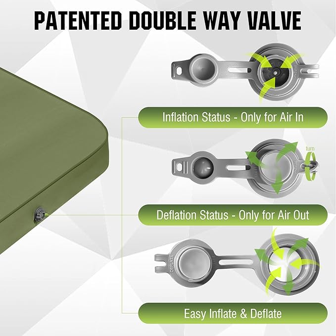 - Easy to Inflate & Deflate: Super easy to inflate this self inflating sleeping pad with the unique double two way valve, making setup quick and convenient, allowing you to focus on enjoying your outdoor adventure. Simply unfold the sleeping mattress, open the valve, and watch it inflate on its own, saving your time and effort. To deflate, simply open the valve and roll up from the pillow side to the foot side