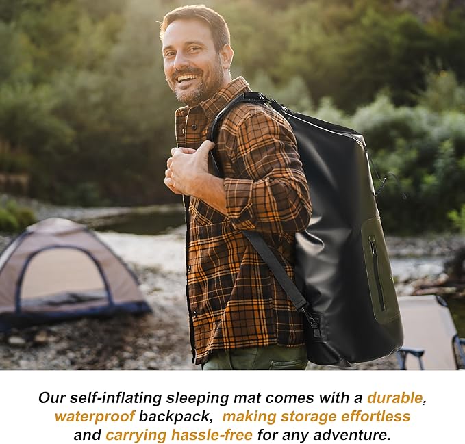 - Effortless Setup & Storage: Simply unroll, open the valve, and let your camping mattress inflate within minutes — no pump required! When it’s time to pack up, just roll it up and store it in the waterproof backpack for easy storage and carrying. The backpack not only protects the inflatable mattress but also keeps it adventure-ready at all times.