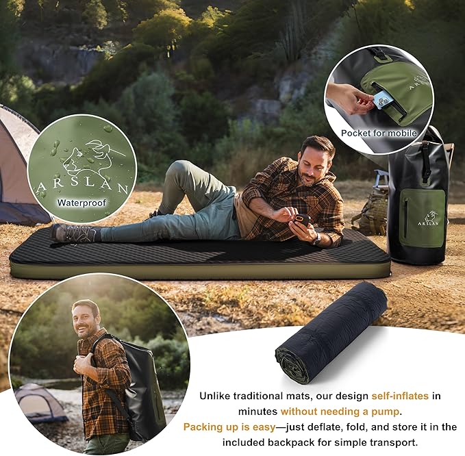 Self-Inflating Sleeping Pad – 4” Thick Memory Foam Camping Mattress with Waterproof Backpack – Portable Sleeping Mat for Backpacking, Tents, SUVs & Trucks