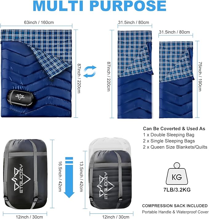 - 【Premium Spacious Dual Sleeping Bag】Tired of fighting for space in your sleep? Our flannel Queen-Sized sleeping bag is a whopping 87x63 inches—4 inches wider than most! Provides luxurious sleeping space for two adults. Perfect for couples who love to sprawl out that allows unrestricted movement. Snuggle up without the squeeze!