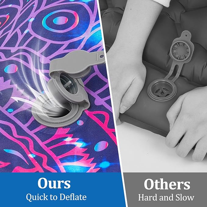 • Fast Inflation with Built-In Foot Pump: No need to bring extra tools! You can inflate this camping sleeping pad in just 1-2 minutes using the built-in foot pump. Deflating it is even faster—just 10 seconds and you're done. PLEASE NOTE: Inflation speed depends on how fast you press the pump. Spend more time enjoying your outdoor adventure and less on setup and takedown. Rest easy, faster than ever.