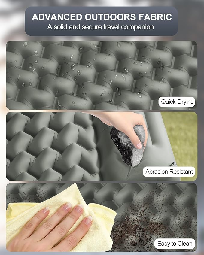 - [Rugged, Quick-Dry Material for Outdoor Use] - Made of upgraded 50D nylon and TPU, this camp sleep pad is tear-resistant, water-repellent, and built to handle rough ground like sand, rocks, or wet grass. Even after a rainy night, it dries fast and stays tough