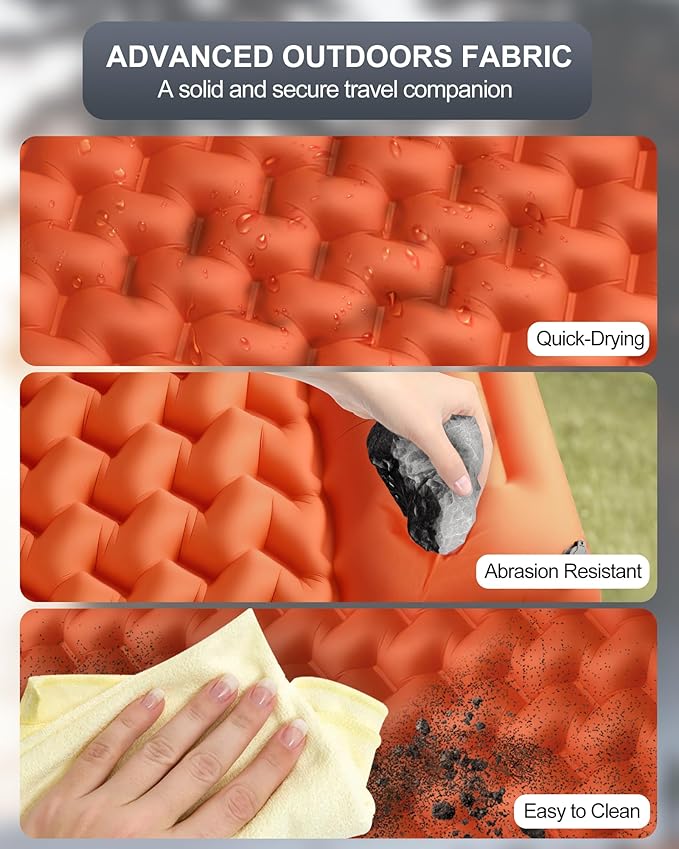 - [Rugged, Quick-Dry Material for Outdoor Use] - Made of upgraded 50D nylon and TPU, this camp sleep pad is tear-resistant, water-repellent, and built to handle rough ground like sand, rocks, or wet grass. Even after a rainy night, it dries fast and stays tough