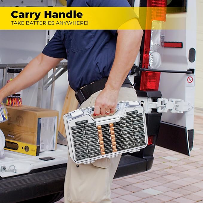 - Durable and Portable Design: With a clear locking lid, secure latches, and a built-in carrying handle for easy portability and storage in many drawers, shelves or emergency kits. Great for professionals, technicians or anyone needing batteries on the go