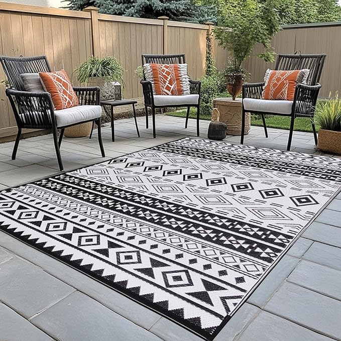 - Reversible Design: This double-sided patio rug features beautiful patterns on both sides, allowing you to quickly flip it over and instantly refresh your patio, porch, backyard, deck, RV campsite, or any outdoor space. A simple way to transform your style effortlessly