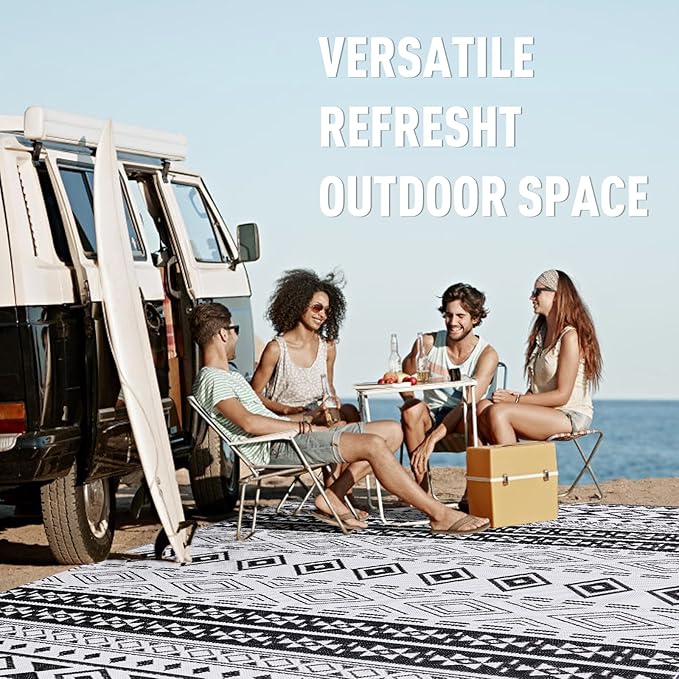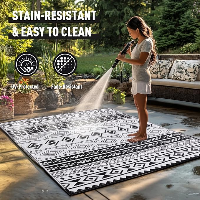 - Reversible Design: This double-sided patio rug features beautiful patterns on both sides, allowing you to quickly flip it over and instantly refresh your patio, porch, backyard, deck, RV campsite, or any outdoor space. A simple way to transform your style effortlessly