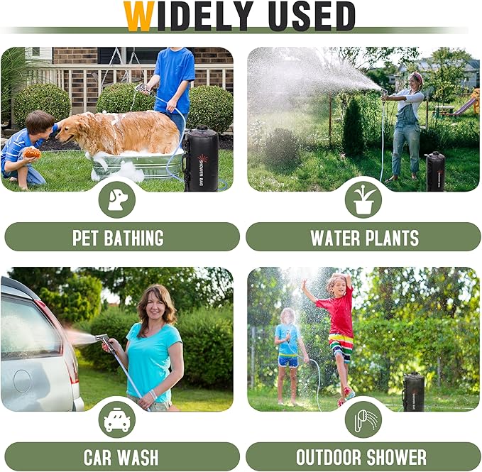 - 【Ultra-compact and lightweight】The shower bag folds down to 8.3" X 5.1" and weighs only 2.6 lbs. It easily fits in a backpack, car trunk, or RV storage compartment. The integrated design eliminates loose parts - just unfold and fill. The reinforced wide strap can be easily hung on a tent, tree, or backpack, giving you a perfect hiking or beach trip