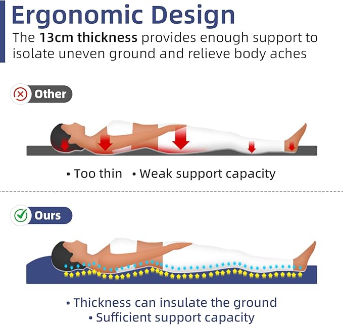 - 【Ultra Wide Comfort, 5.1" All-Night Support】The 5.1-inch (13 cm) thick camping mattress features an innovative arched back that provides spinal alignment and pressure relief, while raised edges prevent rolling off and create a cozy "sleeping zone." Integrated pillow eliminates the need for extra gear.