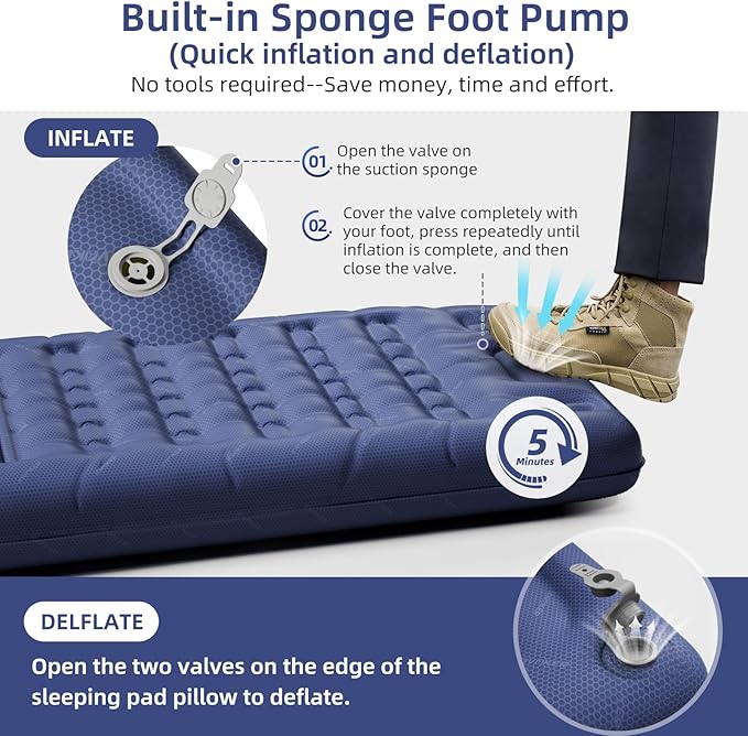 - 【Double Valve-30S Inflate 1S Deflate】 Sleeping pad design with integrated foot pump, No more manual pumping or carrying extra tools! Our high-resilience sponge foot pump allows quick inflation, saving time and energy. Simply step to inflate, then unplug the valve for instant deflation and compact storage. Perfect for campers who value convenience and efficiency.