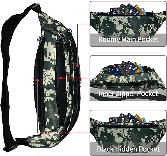 - 【Fanny Pack with 3 Zippered Compartments】Include main pocket,front pocket and back pocket. (1)Main pocket can easily hold your most needed items such as purse, keys and other items. (2) Front pocket can easily carry your phone, because it is large and seperate. (7)On the back side is great for you to keep your valuables away from the thieves.