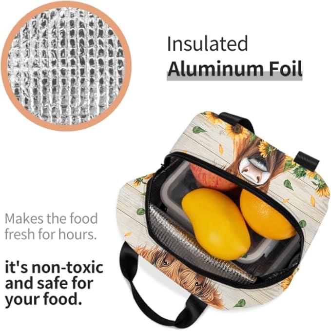 Giwawa Highland Cow Kids Lunch Bag Sunflower Cattle Insulated Girls Lunch Box Yellow Floral Wood Board Thermal Cooler Lunch Tote Bag for Teens Boys School Students Men Women Picnic