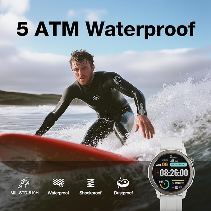 - ๐๐จ๐๐ฎ๐ฌ๐ญ ๐๐ฎ๐ซ๐๐๐ข๐ฅ๐ข๐ญ๐ฒ - AGM smart watch is built to withstand the toughest conditions, featuring MIL-STD-810H certification for resistance to shock, vibration, and dust. Rated 5ATM and IP68, itโs water-resistant up to 164 feet, ideal for swimming, snorkeling, diving and more