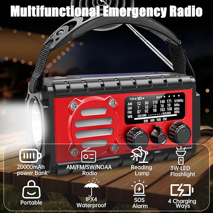 - 20000mAh Emergency Battery | 72-Hour Survival Charging Station--Industry-leading 20000mAh polymer battery charges an iPhone 14 Pro 5 times or powers the radio for 48+ hours. Triple charging options: solar panel, hand crank, and Type-C fast charging. 5 minutes of cranking = 30 minutes of emergency calls. 4-level power indicator + digital display ensures energy control during blackouts.