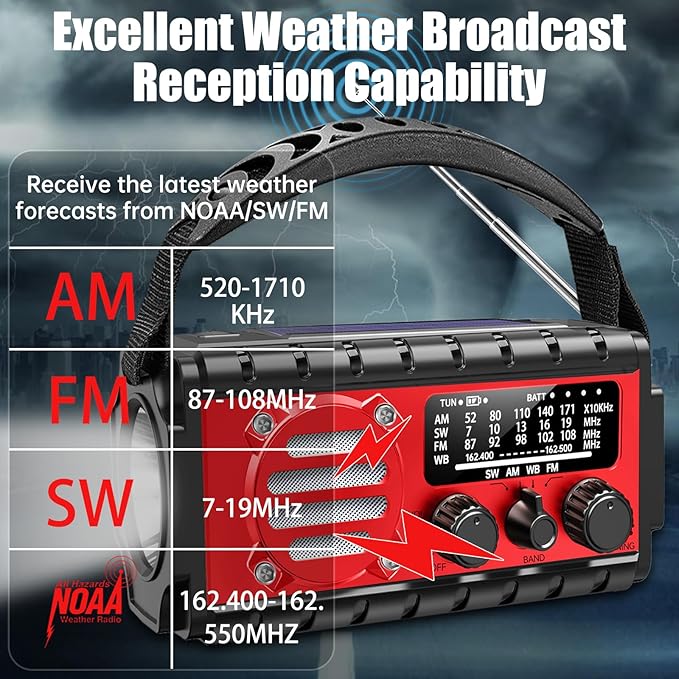 - [Emergency-Ready] NOAA Weather Radio with 360° Signal Reception--The Aivica emergency crank radio features a 20.5" telescopic antenna for precise NOAA/AM/FM/SW band reception, delivering critical alerts for hurricanes, tornadoes, blizzards, and wildfires. Built-in noise reduction chip ensures clear broadcasts during power outages. Ideal for remote camping or mountain emergencies, keeping you connected when networks fail.