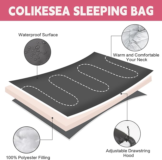 • ➤➤➤POLYESTER SYNTHETIC FILLING - COLIKESEA sleeping bag keeps you warm even if about 33°F.