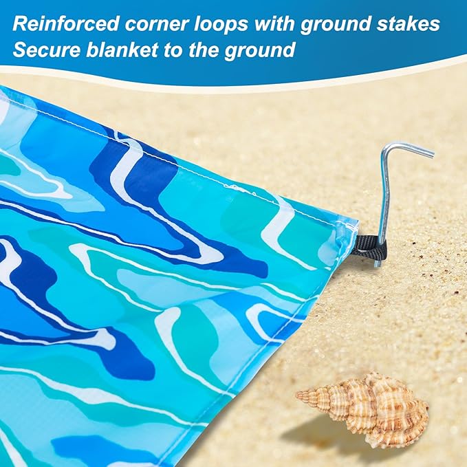 - Beach Picnic Mat:Package includes 1 beach blanket,4 ground stakes,1 carabiner,for secure anchoring during windy coastal adventures.