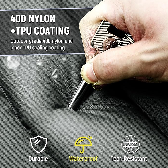 - RESISTANT 40D & SUPER COMFORTABLE: The front of the camping mattress pad is made of sturdy 40D Polyester pongee material + multi-layer waterproof and durable TPU material, which is strong, soft, no noise and waterproof. Even if it gets dirty just wipe it off with a towel. The edge of the camping mat are rigorously heat-sealed, so you don't have to worry about air leaks or tears, even under harsh conditions. Providing extreme pressure-bearing(880lbs). Note: Weight-bearing capacity is based on this criterion.