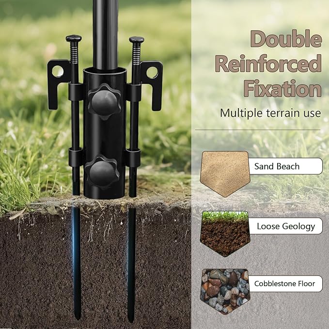- Double Stability: Our camping canopy is equipped with two retainers for a stable setup on a variety of complex terrains, including sand, gravel, and soft ground. It stays in place without collapsing, even in strong winds and heavy rain, to ensure you have a safe and secure camping environment
