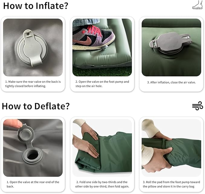 - 【Inflates Fast, Deflates Faster】No pump, no stress. Step on the self inflating camping mattress pad for camping for 30-60 seconds and it's ready.Deflates in 1 second with the upgraded air valve-no air leaks, no wasted breath, no gearheadaches