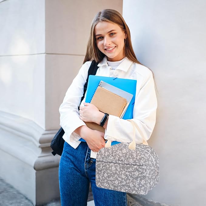 - LARGE CAPACITY: The lunch bag measures 10.2 LX 7.4 W X 7.8H inches. Lunch tote bag for women is spacious enough to fit your lunch box. Such as put mobile phones, tissues, spoons, keys, wallets, sandwiches, salads, drinks and fruits, etc. Perfect for packing all your food and snacks for the day.