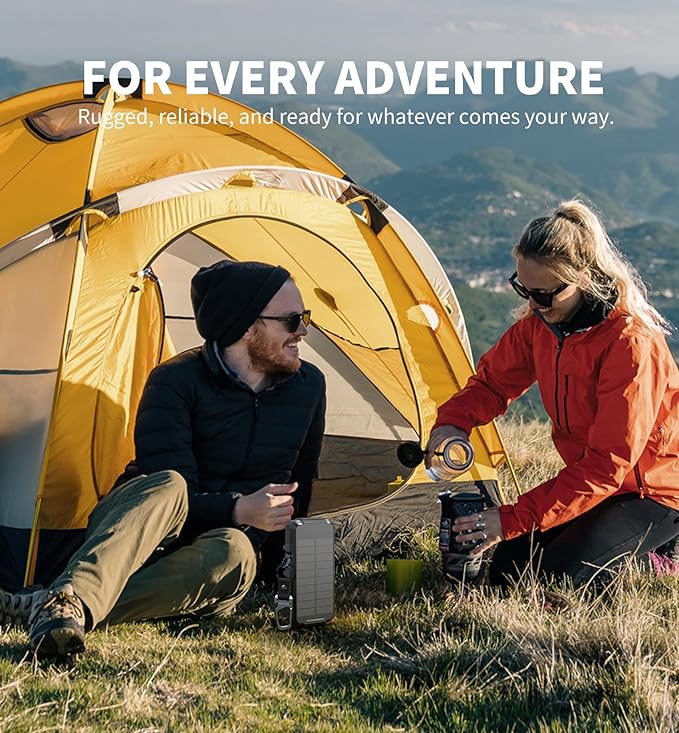 - Dual recharging options: Stay charged anytime, anywhere with this portable solar charger; It can be charged via the built-in solar panel in about 50 hours of direct sunlight, or you can quickly top it off with the included Type-C cable in just 3 hours; Please note the cable charging requires a 45W adapter (not included).