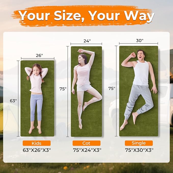 - Pure Memory Foam Comfort: This premium memory foam camping mattress is made for pressure-free and restful sleep, providing a comfortable sleeping space whether used as a cot mattress pad, floor sleeping mat, or car camping mattress. Also, the camping mattress memory foam self-recovers after each use. Also, the soft cloth cover prevents heat loss from your body, allowing you to get plenty of rest.