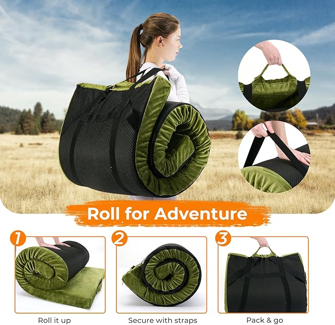 - Pure Memory Foam Comfort: This premium memory foam camping mattress is made for pressure-free and restful sleep, providing a comfortable sleeping space whether used as a cot mattress pad, floor sleeping mat, or car camping mattress. Also, the camping mattress memory foam self-recovers after each use. Also, the soft cloth cover prevents heat loss from your body, allowing you to get plenty of rest.