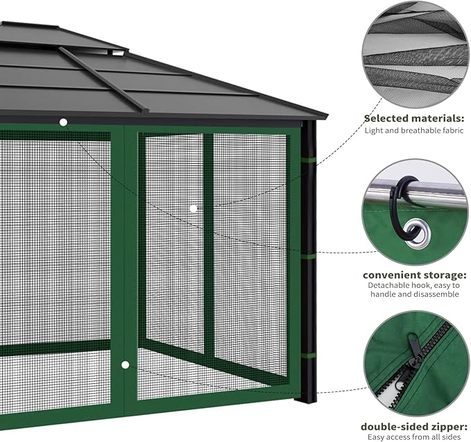Gazebo Replacement Mosquito Netting Outdoor Universal Gazebo Canopy 4-Panels Screen Sidewalls with Zipper for Patio Garden (Green, 10x10)