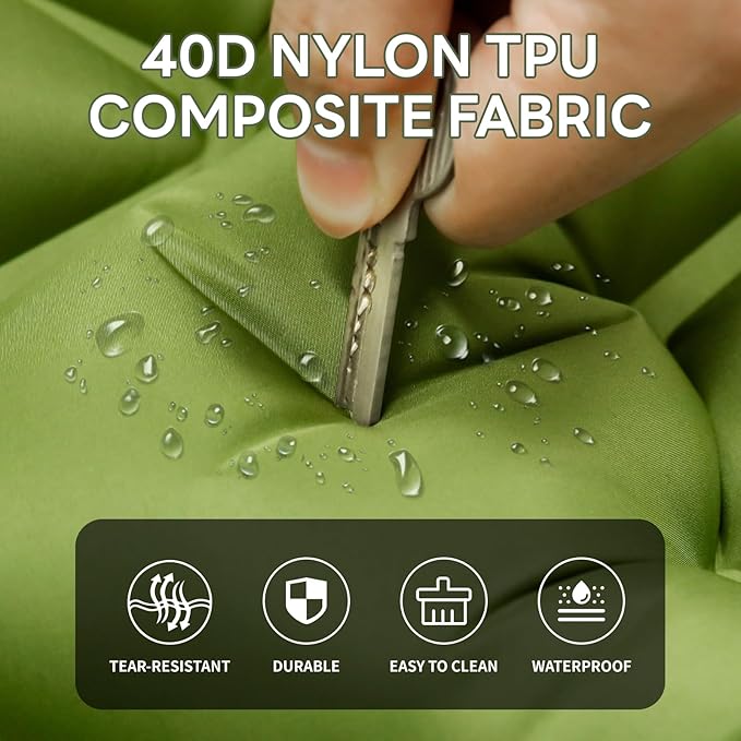 - 🛡️【40D Nylon & Super Durable】Camping sleeping pad made of outdoor grade material 40D nylon, providing extreme pressure-bearing and durability. The edge of the camping mat is heat-sealed, so you don't have to worry about air leaks or tears, even under harsh conditions.